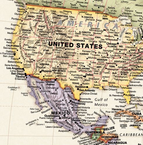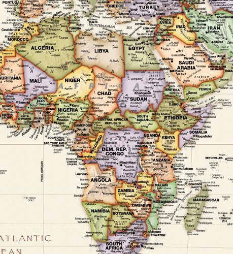 Wall Map include: international boundaries and national capitals along with other major cities; major physical features such as mountain ranges, major mountain peaks, island chains, and deserts; and major water features such as oceans, seas, gulfs, and rivers.